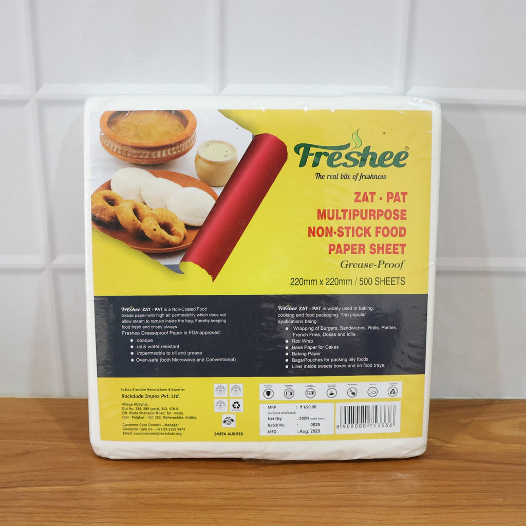Zat-Pat Multipurpose Non-Stick Food Paper Sheets – 220 × 220 mm, 500 Sheets | Grease-Resistant, Moisture-Barrier Wrap/Liner for Snacks, Rolls, Burgers, Bakery & Tiffin